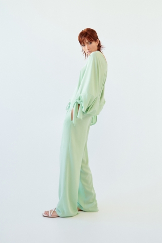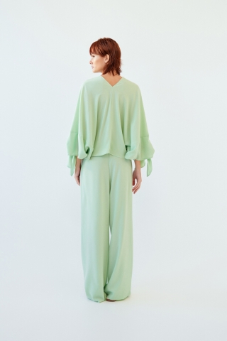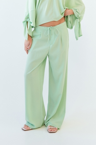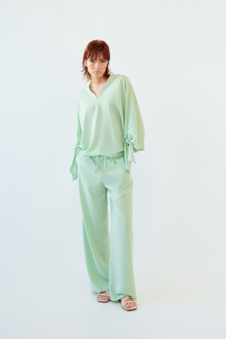 Broek Lumina groen is een broek van het merk Lumina. Een recht model met elastiek en lint om te strikken. De broek heeft vooraan plooien en twee insteekzakken. De broek valt heel soepel.