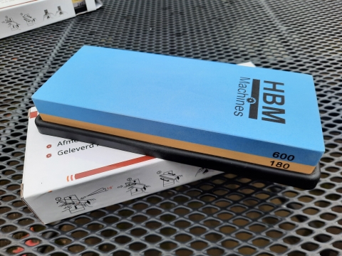 De zijde met korrel 180 gebruik je om redelijk snel de vouw of de snede vorm te geven. De zijde van korrel 600 is voor veel gereedschappen en messen fijn genoeg om een mooie scherpe snede op te leveren, maar wordt voor keukenmessen meer gebruikt als een tussenstap naar de steen van korrel 1000 en 3000 voor een heel fijne en scherpe snede. Dat laat ik ook zien in mijn workshops die ik geef in de workshopruimte van Combidee