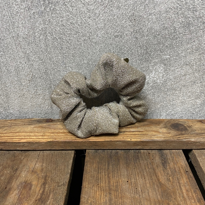 Handgemaakt Model: Scrunchie original Materiaal: Lurex Kleur: Grijs, beige met glitters Omtrek: 12 cm
