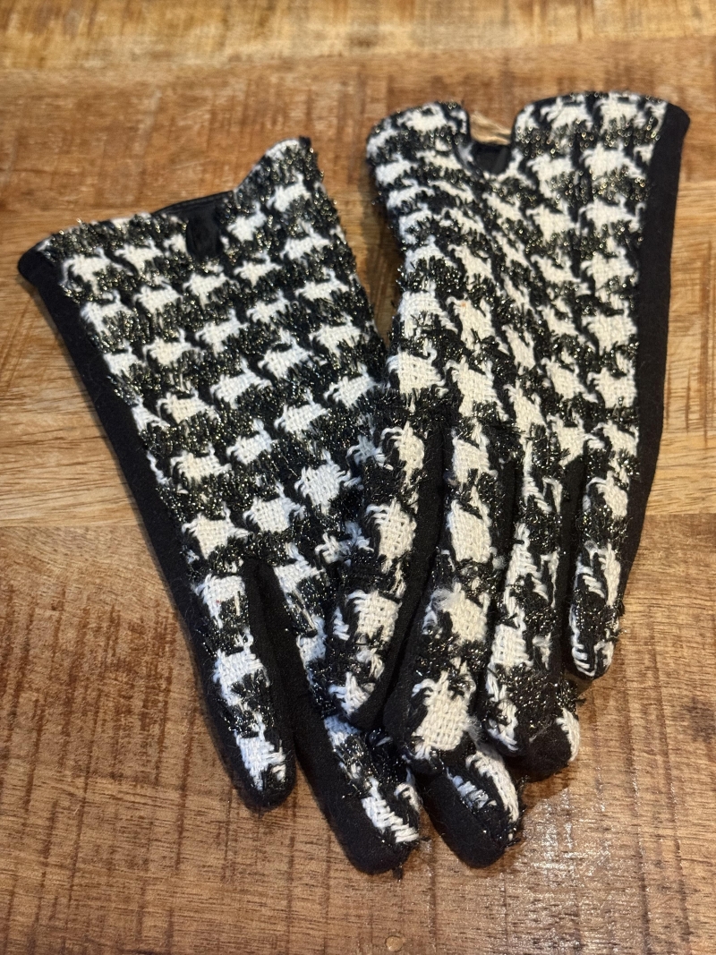 Mooie handschoenen met pied de poule motief in zwart, wit en een gouddraadje en met een geborduurd hartje onderaan op de wijsvinger om je gsm te kunnen bedienen terwijl je ze draagt. 1 size