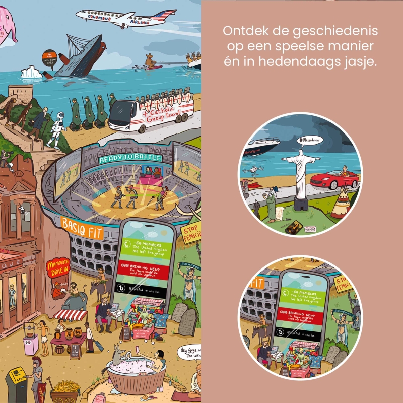 De strafste en meest spraakmakende gebeurtenissen van de geschiedenis in een modern jasje. Legendarische figuren en gebouwen krijgen een modern jasje. Denk aan de Vikingen op een speedboot, Cleopatra die een live-stream doet of 3D-geprinte vazen van de Grieken.