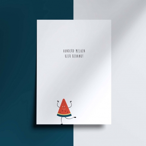 Een grappige bedankkaart met een illustratie van een vrolijke meloen en de humor tekst: 'Een meloen keer bedankt!'