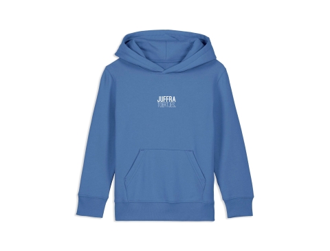 Blauwe hoodie met opschrift JUFFRA TOERTJES. voor kinderen. Als cadeau of gewoon voor jezelf. Recht uit Antwerpen. Met trots voor het dialect.