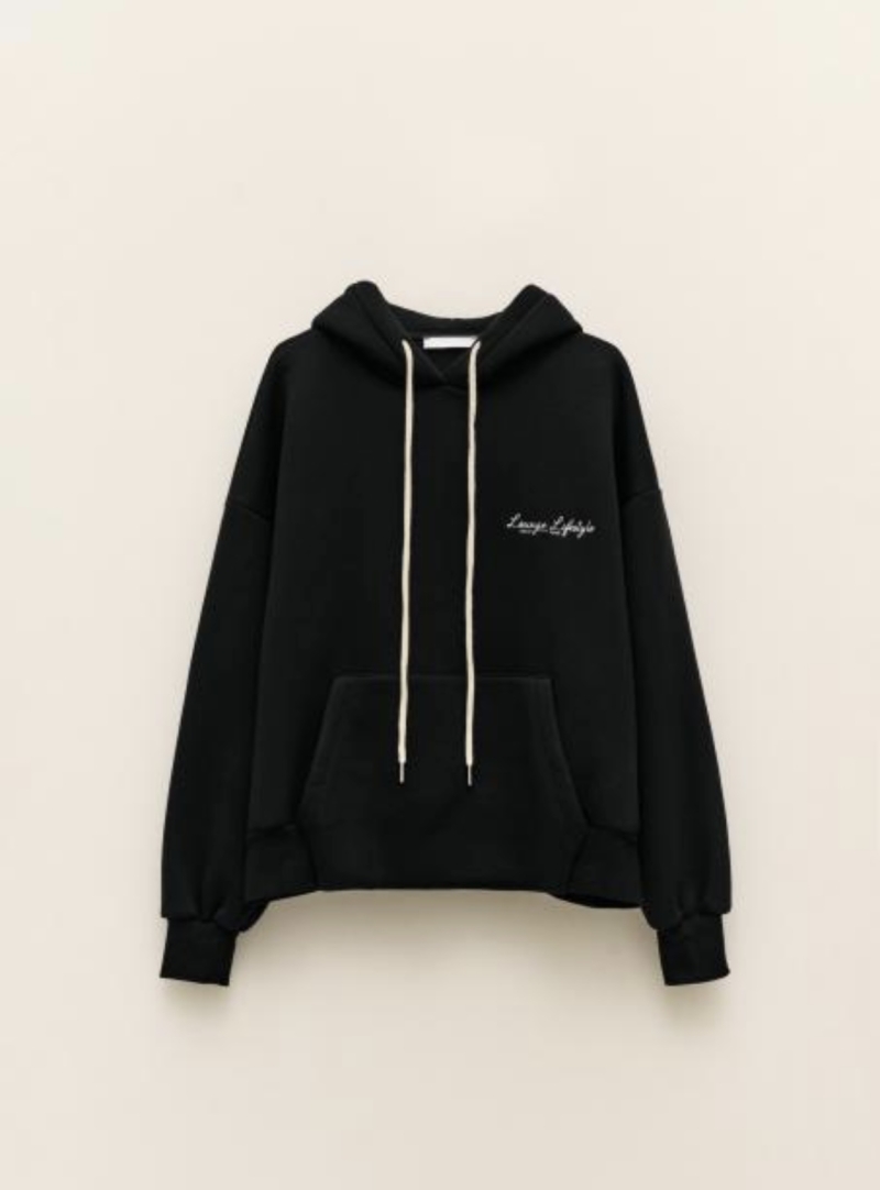 De hoodie is voorzien van een kap en een korte off-white koord aan de hals, wat zorgt voor een sportieve touch. Op borsthoogte staat de tekst “Lounge Lifestyle since 2008” in witte letters, wat het ontwerp een eigentijdse en relaxte uitstraling geeft.