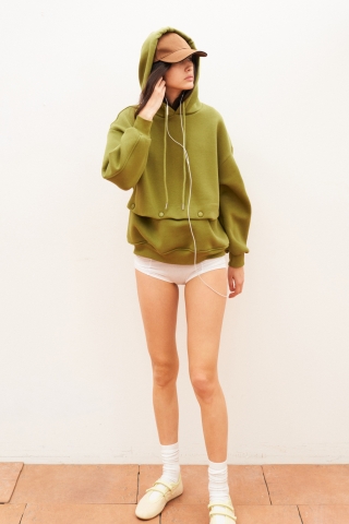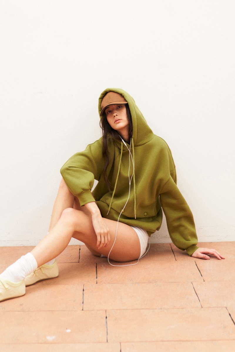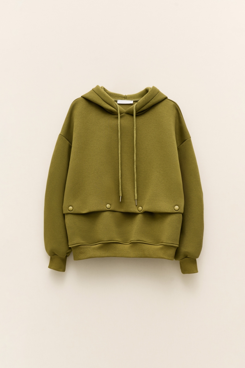 Het extra knoopdetail geeft de hoodie een unieke twist en onderscheidt hem van een standaard hoodie, terwijl de olijfgroene kleur eenvoudig te combineren is met jeans, broeken of rokken.