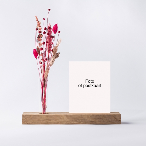 Mooie houten kaarthouder met een vaasje waarin naturel droogbloemen staan, geleverd excl kaart. Kies zelf een bijpassende wenskaart of foto