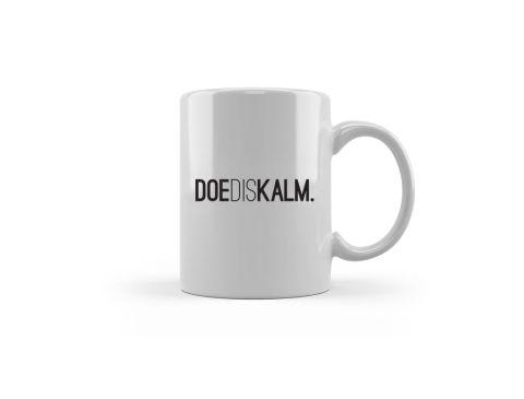 Stevige witte koffietas met daarop de tekst DOEDISKALM. Onderaan de tas afgewerkt met het logo van KLEIR.