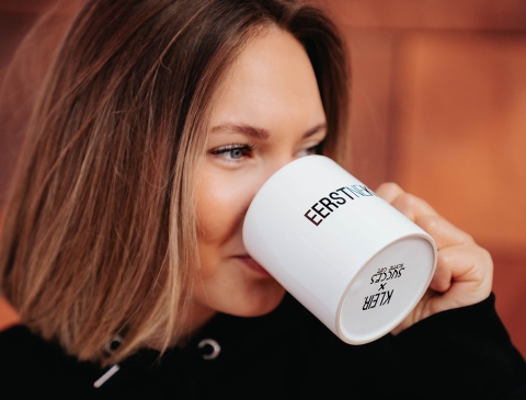 Stevige witte koffietas met daarop de tekst EERSTNEKOFFE. Onderaan de tas afgewerkt met de logo's van KLEIR. en Succes Koffie.