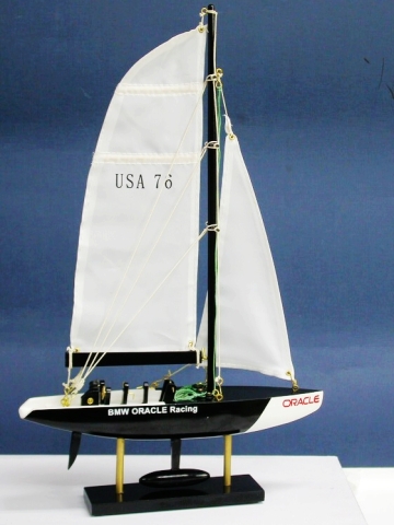 Miniatuur “Oracle” “America Cup” Handgemaakt Lengte 24,7 cm Hoogte 40 cm Breedte 5,2 cm De America's cup of the Auld Mug is een zeilwedstrijd of regatta, die voor het eerst in 1851 werd gehouden. Daarmee wordt het door velen beschouwd als het oudste internationale sportevenement. Het is in ieder geval de oudste trofee waar nog om wordt gestreden. De eerste race werd georganiseerd door The Royal Yacht Squadron. De America's Cup is genoemd naar de eerste winnaar van de race, het jacht America van The New York Yacht Club, dus niet naar de Verenigde Staten. In eerste instantie werd er in grote schepen tot ca. 27 m waterlijn gezeild, daarbij werd aan iedere boot voor de uitslag een handicap toegekend. Van 1930 tot 1937 werd in de nog steeds grote J-klasse van ca. 24 m gezeild, daarna in de veel kleinere 12 meter klasse, ca. 14 m. Tegenwoordig zeilt men in ontwerpen die specifiek voor het evenement worden gemaakt, de America's cup klasse. Op dit moment is dat de AC72-klasse, met een vleugel uitgeruste catamarans. Meestal is het krachtsverschil tussen de twee landen vrij groot. Alleen in 1920, 1983 en 2013 was er geen afgetekende overwinning en werd met maar één wedstrijd verschil gewonnen, wedstrijden voor 1876 niet meegerekend. In 2013 kende de wedstrijd tussen Amerika en Nieuw-Zeeland een zeer spannende ontknoping toen de Amerikanen een 8-1-achterstand goedmaakten en met 9-8 de titel behielden.