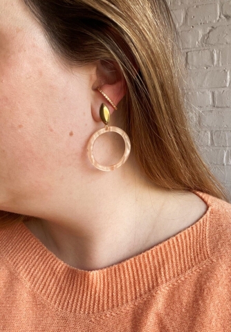 Goudkleurige roestvrijstalen oorstekers gecombineerd met een hele toffe resin hanger in de kleur 'peach pink'. De zon begint instant te schijnen als jij binnenkomt!