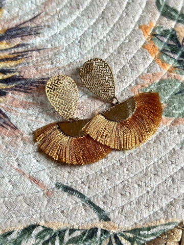 Speelse koraalkleurige waaiertjes uit brass metaal en katoen aan een goudkleurige, roestvrijstalen oorsteker.