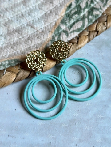 Zilverkleurige, nikkelvrije oorstekers werden gecombineerd met een metalen hanger met turquoise rubbercoating. Fijn om te dragen en licht van gewicht. Ongeveer 4 cm lang.
