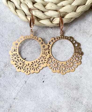 Een roestvrijstalen rosé oorhanger met daaraan een nikkelvrije filigraan hanger met bloemmotief.