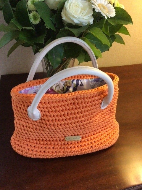 Fris oranje handtasje dat de show Steelt . Dit tasje is gevoerd met een speels stofje met vismotief.