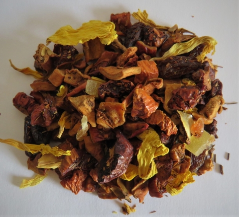 Naast rooibos en perzik bevat deze thee stukjes appel, gekonfijte stukjes papaya, rozijnen en zonnebloembloesem.