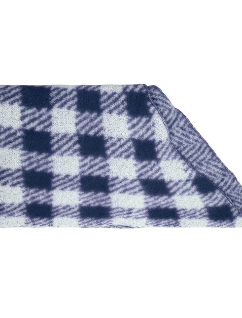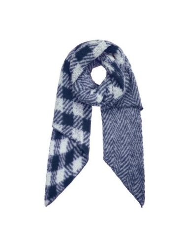 Half geruite, half gestreepte wintersjaal, verkrijgbaar in camel en blauw.
