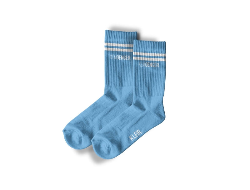 Comfortabele lichtblauwe sokken met opschrift KEMOENGRER. voor volwassenen. De kousen hebben een normale pasvorm met verdikking aan de zool voor extra comfort. Als cadeau of gewoon voor jezelf. Recht uit Antwerpen. Met trots voor het dialect.