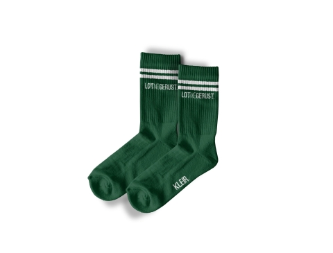 Comfortabele donkergroene sokken met opschrift LOTMEGERUST. voor volwassenen. De kousen hebben een normale pasvorm met verdikking aan de zool voor extra comfort. Als cadeau of gewoon voor jezelf. Recht uit Antwerpen. Met trots voor het dialec