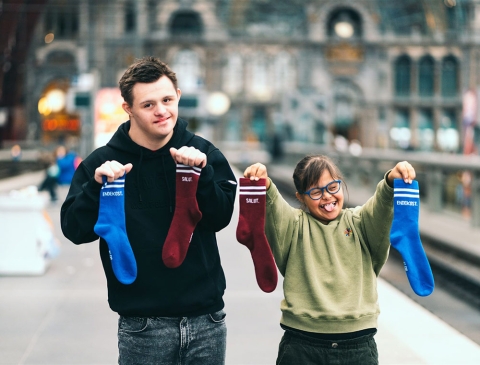 Comfortabele rood-blauwe sokken met opschrift SALUT. ENDEKOST. voor volwassenen. De kousen zijn stevig, redelijk dik en hebben een normale pasvorm met een extra verdikking aan de zool voor extra comfort. Als cadeau of gewoon voor jezelf. Recht uit Antwerpen. Met trots voor het dialect.