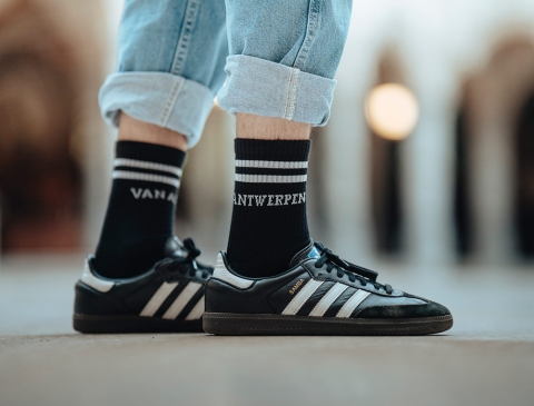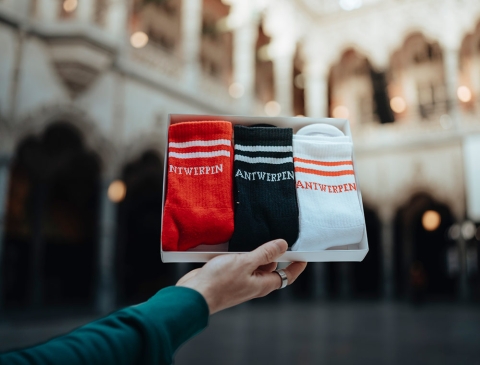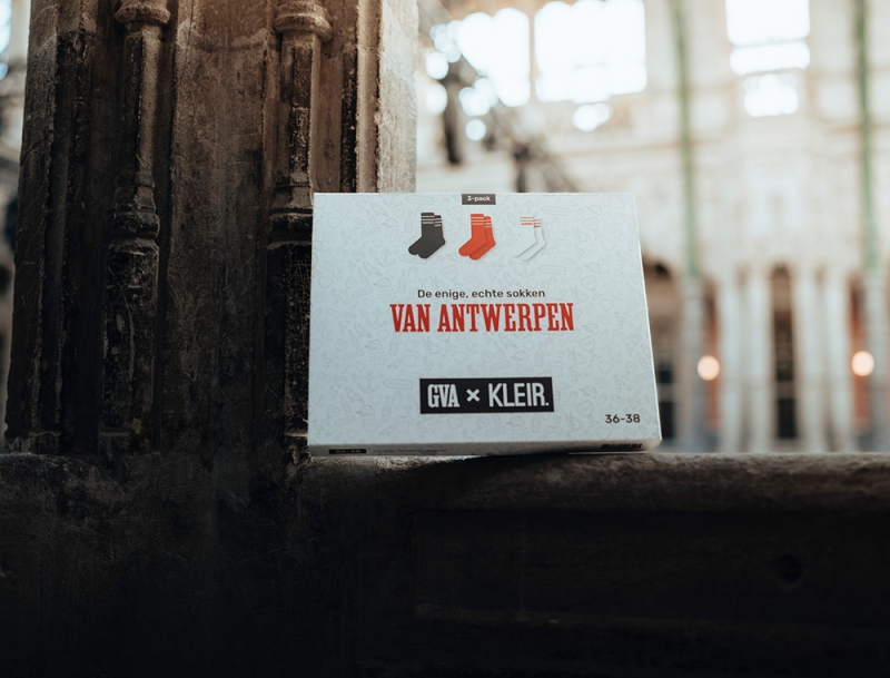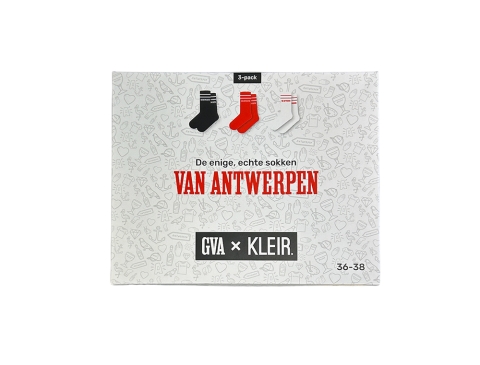 3 paar sokken* met opschrift "Van Antwerpen" in het typische GVA-lettertype. Als cadeau of gewoon voor jezelf. Recht uit Antwerpen.
