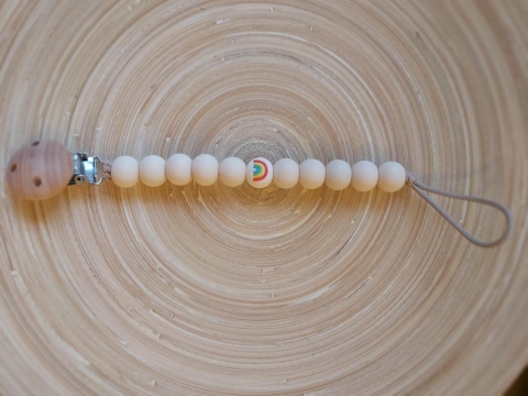 ✄ Materiaal: Kralen: silliconen kralen, BPA vrij Clip: hout met metalen sluiting Garen: parakoord
