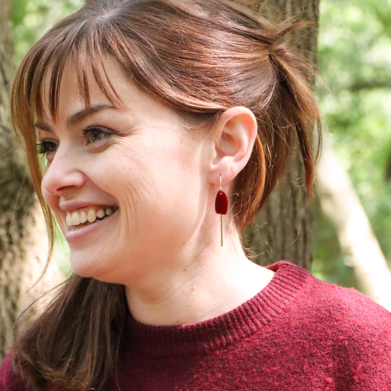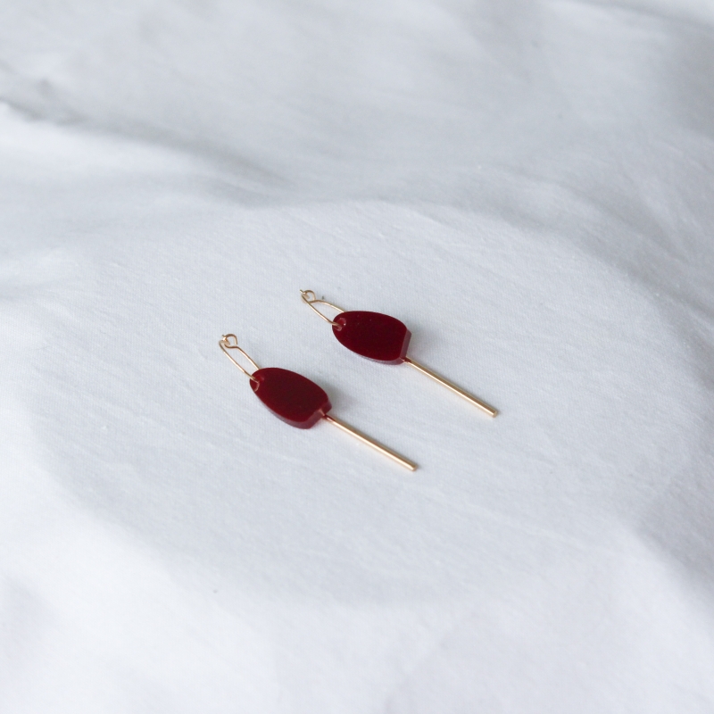 Totale lengte: 7,7 cm Totale breedte: 1 cm Materiaal: Gold plated, nikkelvrije messing, acryl Kleur: bordeaux