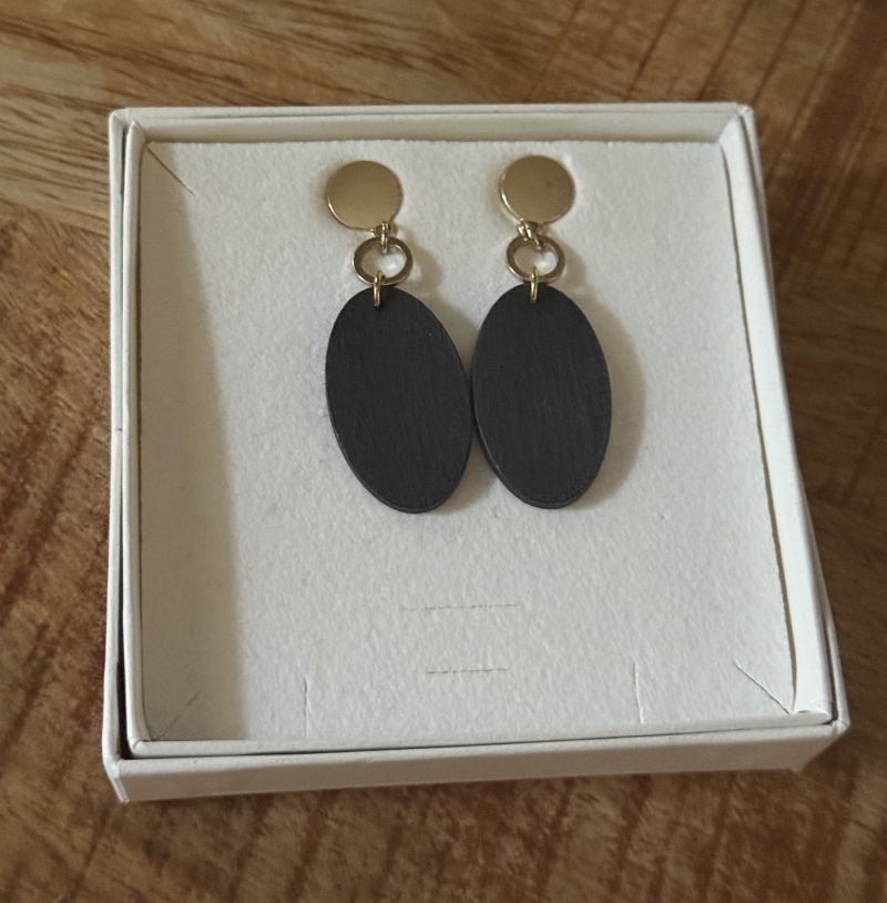 Handgemaakte oorbellen van Studio Nok Nok. Materiaal: stainless steel RVS - Upcycled essenhout Kleur: goud en zwart