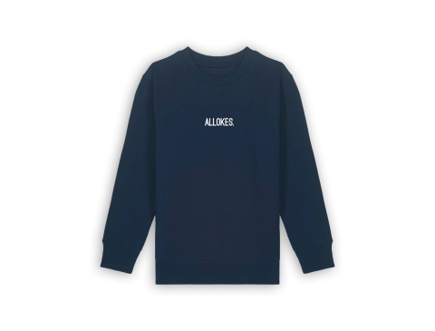 Donkerblauwe sweater met opschrift ALLOKES. voor kinderen. Als cadeau of gewoon voor jezelf. Recht uit Antwerpen. Met trots voor het dialect.