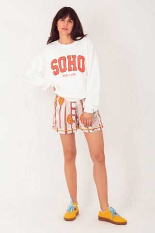 Sweater Arty wit met neonrood is van het merk Turquoise by Daan. Het is een rechte witte sweater met boorden en het woord 'SOHO New York' in fluorode letters.