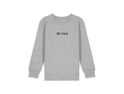Grijze sweater met opschrift DOEDISKALM. voor kinderen. Als cadeau of gewoon voor jezelf. Recht uit Antwerpen. Met trots voor het dialect.