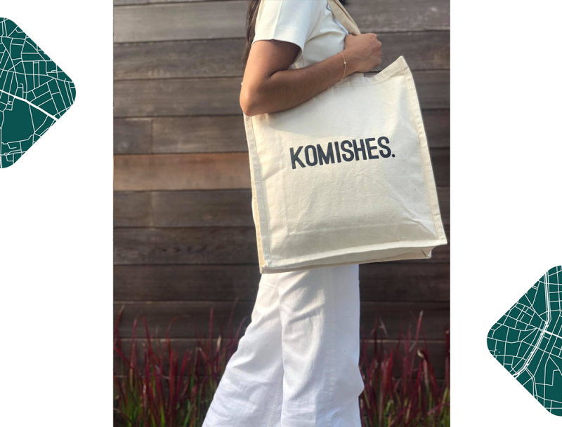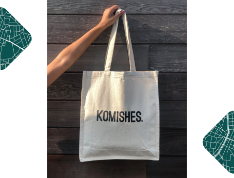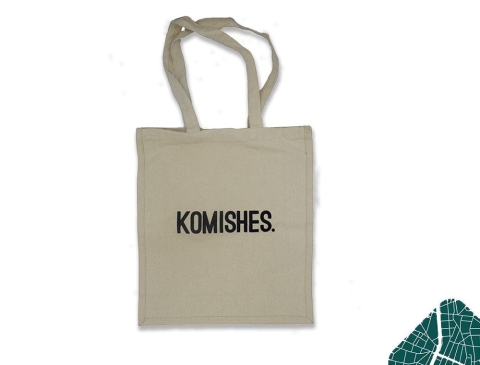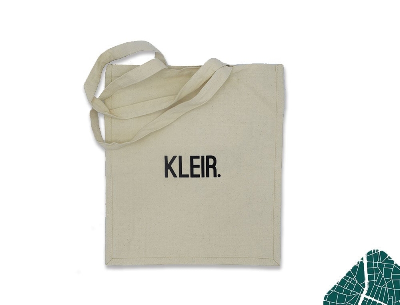 Stevige linnen zak met opschrift KOMISHES. aan de ene zijde en het logo van KLEIR. aan de andere kant.
