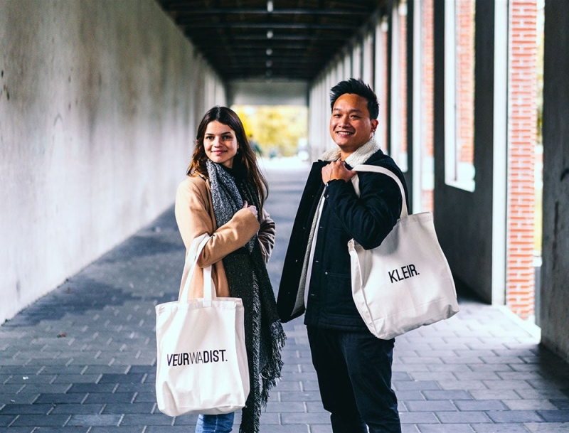 Stevige linnen zak met opschrift VEURWADIST. aan de ene zijde en KLEIR. aan de andere kant.