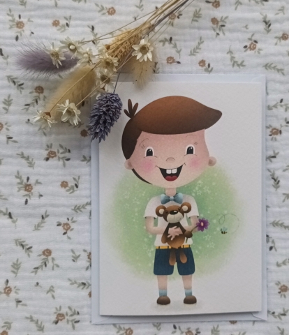 Formaat postkaarten: A6 (148mm x 105mm) Inhoud: 1 gevouwen kaart, 1 omslag en 1 sticker aan de hand van de wenskaart.