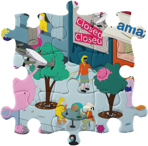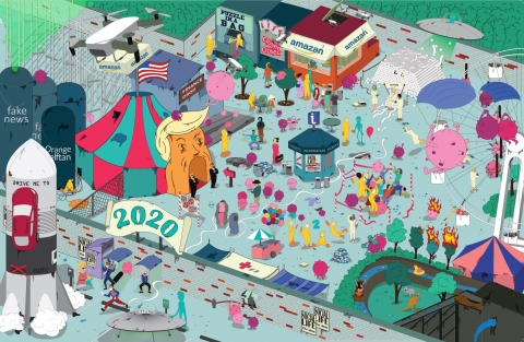 2020 was een knotsgek jaar. Daarom creëerden we dit puzzel-pretpark, in samenwerking met Lars Dombrecht. Zoek mee naar alle details, zoals de coronavirusjes, het zorgpersoneel op hun troon en de Brexit...