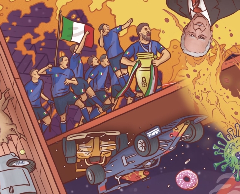 2021 deed ons soms in rondjes ronddraaien: wachten op vrijheid, op vaccins, maar ook verloren tijd inhalen. Daarom ook deze oneindige trappen puzzel, met 50 referenties naar het jaar 2021. Spot jij ze allemaal?