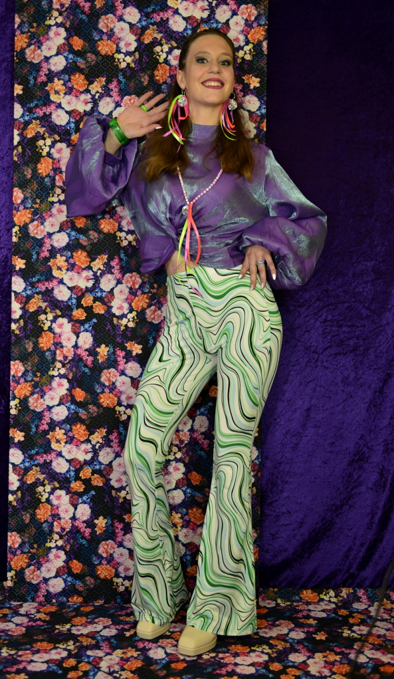 Blouse Luza paars is een blouse van het merk Luzabelle Paris. Het is een cropped blouse met puffy mouwen met manchette. De draai onderaan in de blinkende stof geeft de blouse een speelse twist. Niet alleen leuk voor een thema-avond, zoals disco of flower power. Ook superleuk voor festival of feest.