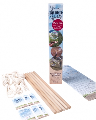 Inhoud: Bubblepowder voor 15 liter sop, 6 stokken en touw (voor 3 sets) + handleiding (Nederlands, Duits, Frans en Engels)