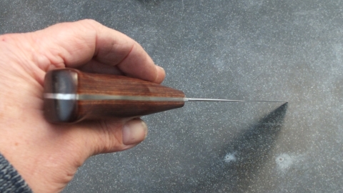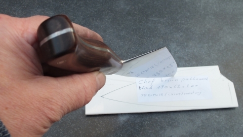 Het mes heeft een handvat in donker bruin pakkawood. ( Dit onder hoge druk en temperatuur samengesteld materiaal van fineer en phenolhars neemt geen vocht op en is hygiënisch) De schalen zijn bevestigd met epoxy en roestvrijstalen bouten.