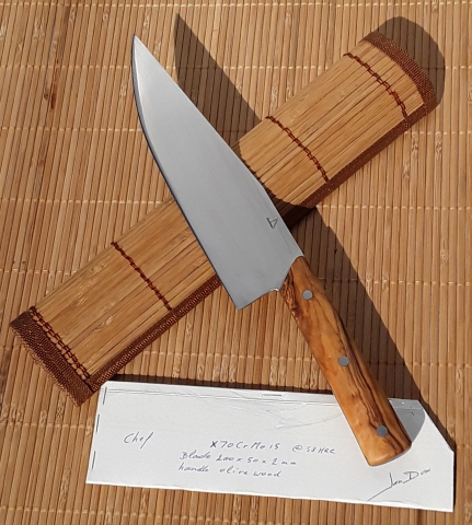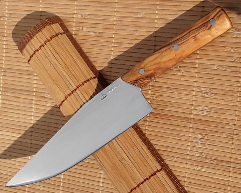 Dit chefmes, in de grootte van de traditionele “demi-chef” is een veelzijdig traditioneel mes in de westerse keuken. De lange gebogen snede maakt wiegend snijden van groenten makkelijk. Het rechtere deel meer naar het handvat maakt ook drukkend snijden op oosterse wijze mogelijk. De afgeschuinde rug is recht naar beneden naar de punt/snede gebracht. De scherpe punt is ideaal voor fijn werk. De rechte rug kan zo beter gebruikt worden om de snijplank proper te schrapen en het gesneden voedsel in de kookpot of kom te schuiven, zonder de snede extra te belasten die zo langer scherp zal blijven. Door de hoogte is het makkelijk om groenten van de snijplank op te scheppen. Het is ook comfortabel om tegen de vingers van de ondersteunende hand te glijden tijdens het snijden.