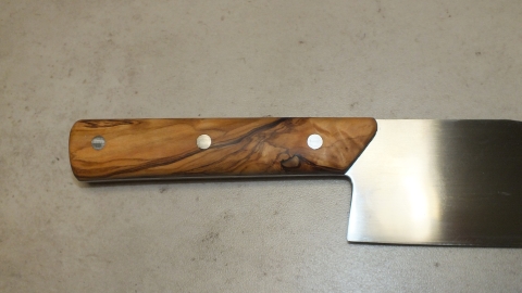 Het rechte handvat is geïnspireerd op de Japanse “Wah” handvaten van Japanse keukenmessen. Dit handvat leent zich goed voor de professionele “pinch grip” waarbij het mes principieel tussen duim en wijsvinger wordt vastgenomen vóór het handvat zelf. Ook typisch op Japanse messen.