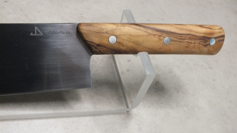 Materialen: lemmet in roestvrij staal, 70CrMo15, gehard, diepgekoeld en 2x getemperd tot 58HRC. Deze staalsoort is reeds jaren een van de favorieten van de Duitse scheermesindustrie. Heft in geolied olijfhout. Regelmatig behandelen met minerale olie is aangewezen om de tekening het mooiste te houden. ( olie voor behandeling van houten snijplanken is perfect ). De greepschalen zijn met roestvrijstalen bouten bevestigd en verlijmd met epoxy.