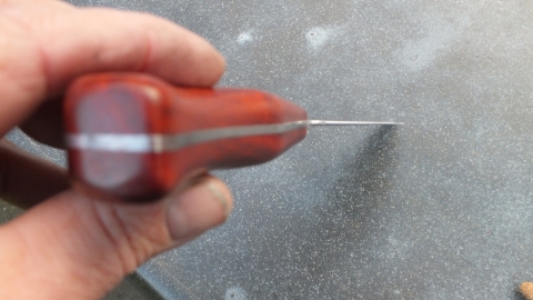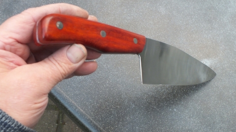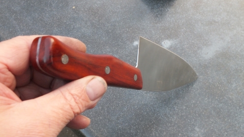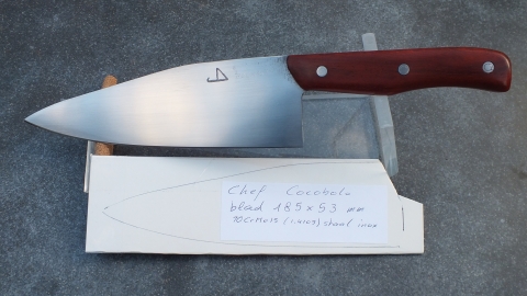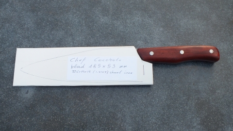 Het mes heeft een handvat in Cocobolo, een houtsoort uit de familie van de rosewoods, met een dichte structuur die van zichzelf oliën bevat. Het mes mag NIET in de vaatwasmachine.