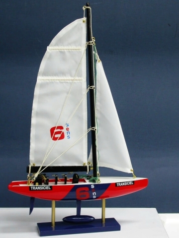 Miniatuur “Transiciel” “America Cup” Handgemaakt Lengte 24,7 cm Hoogte 40 cm Breedte 5,2 cm De America's cup of the Auld Mug is een zeilwedstrijd of regatta, die voor het eerst in 1851 werd gehouden. Daarmee wordt het door velen beschouwd als het oudste internationale sportevenement. Het is in ieder geval de oudste trofee waar nog om wordt gestreden. De eerste race werd georganiseerd door The Royal Yacht Squadron. De America's Cup is genoemd naar de eerste winnaar van de race, het jacht America van The New York Yacht Club, dus niet naar de Verenigde Staten. In eerste instantie werd er in grote schepen tot ca. 27 m waterlijn gezeild, daarbij werd aan iedere boot voor de uitslag een handicap toegekend. Van 1930 tot 1937 werd in de nog steeds grote J-klasse van ca. 24 m gezeild, daarna in de veel kleinere 12 meter klasse, ca. 14 m. Tegenwoordig zeilt men in ontwerpen die specifiek voor het evenement worden gemaakt, de America's cup klasse. Op dit moment is dat de AC72-klasse, met een vleugel uitgeruste catamarans. Meestal is het krachtsverschil tussen de twee landen vrij groot. Alleen in 1920, 1983 en 2013 was er geen afgetekende overwinning en werd met maar één wedstrijd verschil gewonnen, wedstrijden voor 1876 niet meegerekend. In 2013 kende de wedstrijd tussen Amerika en Nieuw-Zeeland een zeer spannende ontknoping toen de Amerikanen een 8-1-achterstand goedmaakten en met 9-8 de titel behielden.