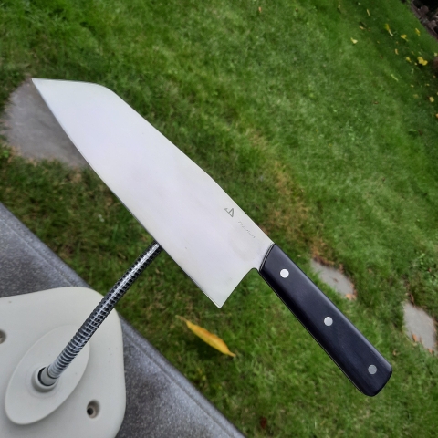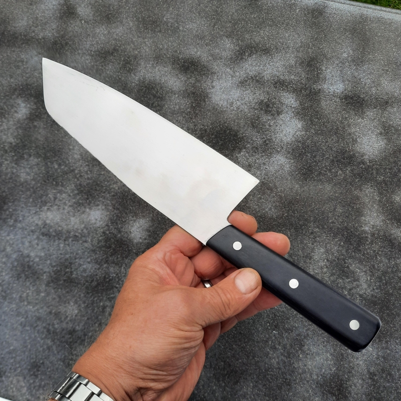 Japanse stijl chefmes met hoog blad .Dit mes maakt het snijden van groenten en andere etenswaren tot een feest. Het hoge blad maakt het snijden en opscheppen een plezier. De iets afgeschuinde rechte bovenzijde maakt het samenvoegen of afschuiven van de gesneden producten in een kookpot makkelijk, zonder de snede te belasten. De hoogte maakt ook het opscheppen vanop de snijplank makkelijker.