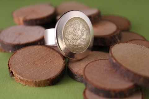 Handgemaakte zilveren ring met structuur, ingelegd let parelmoerkleurige uv hars