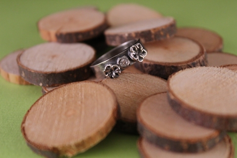 Handgemaakte zilveren ring, gezwart om een oud-zilverlook te verkrijgen, met 2 bloemen en zirconia
