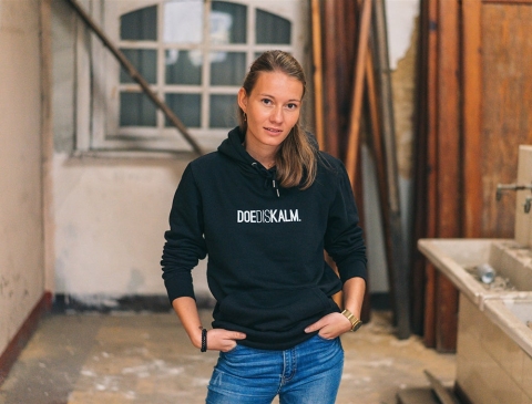 Zwarte hoodie met opschrift DOEDISKALM. voor vrouwen en mannen. Als cadeau of gewoon voor jezelf. Recht uit Antwerpen. Met trots voor het dialect.