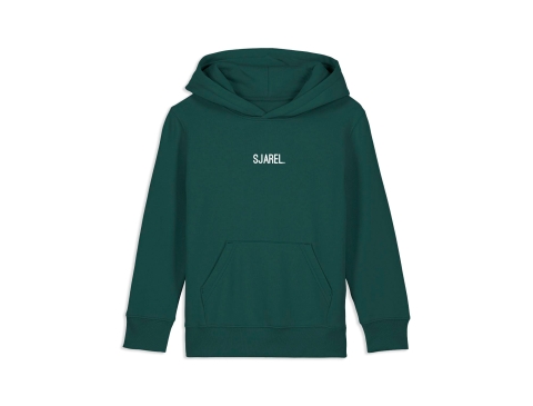 Groene hoodie met opschrift SJAREL. voor kinderen. Als cadeau of gewoon voor jezelf. Recht uit Antwerpen. Met trots voor het dialect.
