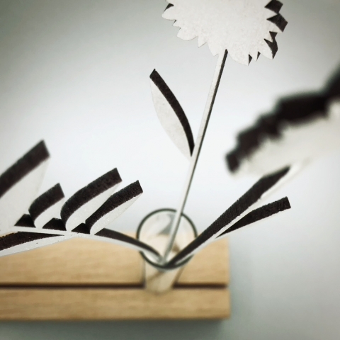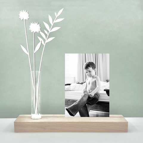 Mooie houten kaarthouder met een vaasje waarin houten bloemen staan (4 stuks), geleverd excl kaart. Kies zelf een bijpassende wenskaart of foto