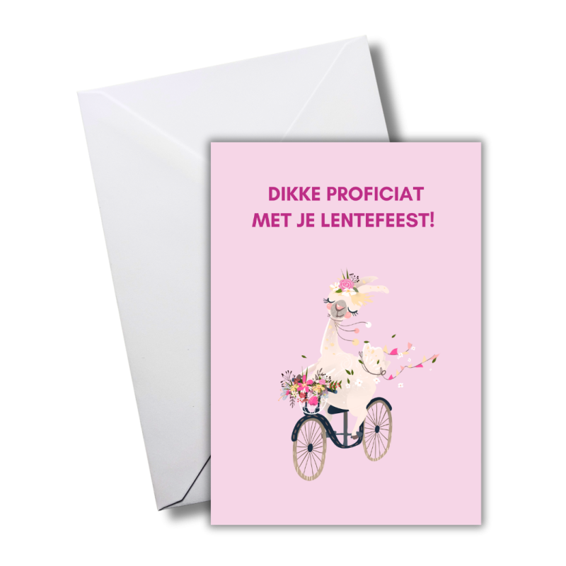 Kaartje voor lentefeest met lama op een fiets